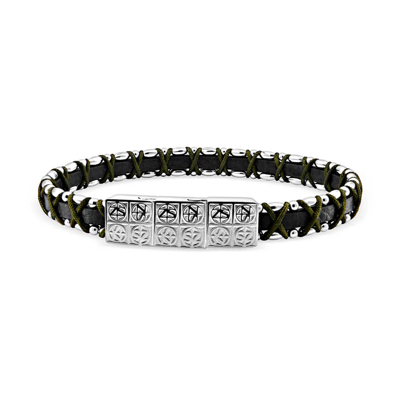 DROMON Black.KA karkötő fekete valódi olasz bőrből, kézzel készített, különböző méretű acélgyöngyökből és khaki zöld színű speciális fonal igényesen összefonott keverékéből A tökéletesen illeszkedő, Damier ZS mintás grafikus csat még stílusosabbá teszi ezt a kifinomult dizájnt. Rozsdamentes acélból készült, könnyen fel- és levehető.
