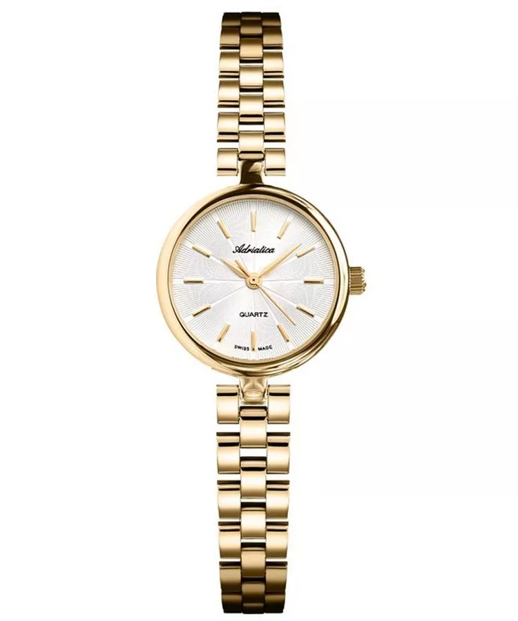 Az Adriatica A3474.1113Q Classic női karóra egy Ronda 763 svájci gyártmányú kvarcművel ellátott modell. 26 mm széles tokja arany színű rozsdamentes acélból készült. A számlap ezüst színű, és ásványi üveg borítja. Az óra szintén arany színű rozsdamentes acélból készült szíjjal rendelkezik, amely harmonikus kölcsönhatásban van az óra többi elemével. Vízállósága 30 méter, ami megvédi az órát a véletlen fröccsenésektől. A teljes kialakítás egy egyszerű és esztétikus női karórát hoz létre, amely a tartós anyagokat és klasszikus megjelenést ötvözi.