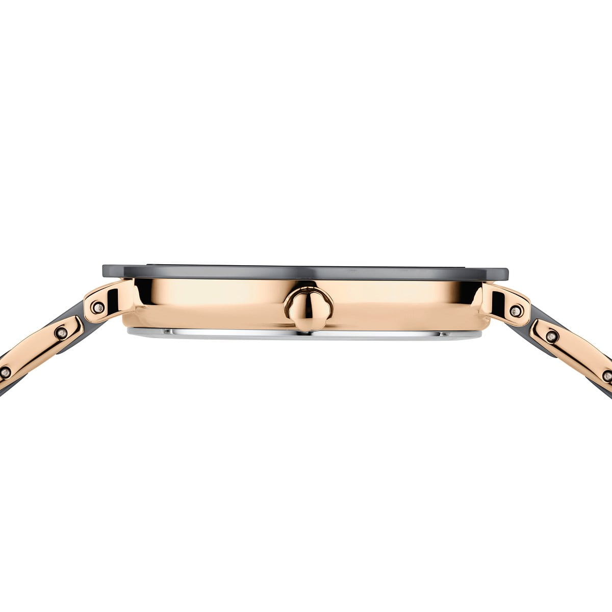 Kiemelkedő részlet a rózsaarany színű rozsdamentes acél és a szürke high-tech kerámia lágy kontrasztja a szíjon. A fényes kerámia lünetta folytatja a harmóniát, meleg, mégis modern megjelenést kölcsönözve az órának. A karcsú tok mindössze 6 mm magas és 35 mm átmérőjű – ideális karcsú csuklókhoz és visszafogott eleganciához. A lapos zafírüveg védi a strukturált számlapot a karcolásoktól.