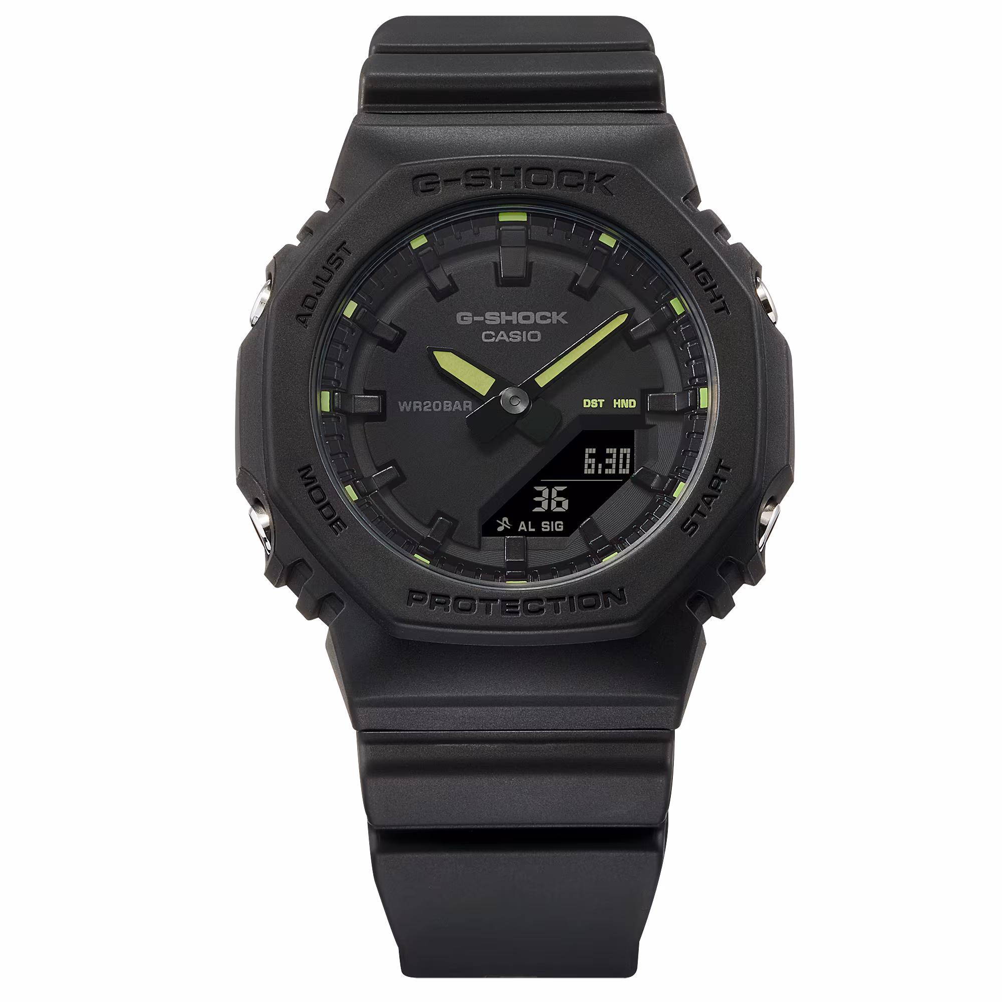 Az óra neon sárga vagy piros színű jelzésekkel, valamint azonos színű, hasonló foszforeszkáló árnyalattal bevont óramutatókkal rendelkezik. Ezek a színes részletek vibrálóan egyéni stílust kölcsönöznek az óra nyolcszögletű formájának és áramvonalas, teljesen fekete dizájnjának.