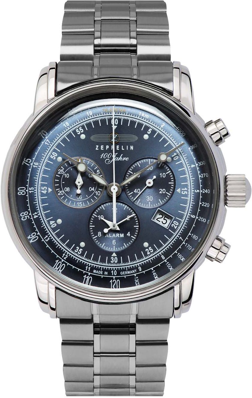 A Zeppelin 7680MB-3 100 Jahre modellel az idő már nem tartogat titkokat Ön előtt. Ez az időmérő számos hasznos funkcióval rendelkezik, mint például a 4 óránál található dátumkijelző, amely a hónap aktuális napját mutatja, az ébresztő, mely egy kiválasztott időpontban hangjelzést ad, a kronográf, és a tachiméter az átlagsebesség meghatározására. Hat köves svájci kvarc szerkezet (Ronda Cal.:5130.D) garantálja a pontos időmérést. A rendkívüli technikai képességek és a figyelemre méltó formatervezés kombinációja a Zeppelin 7680MB-3 100 Jahre órát igazi művészi alkotássá teszik.