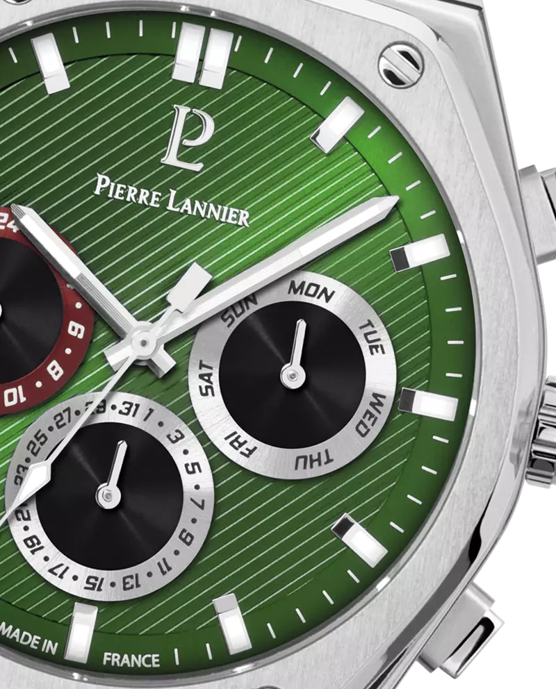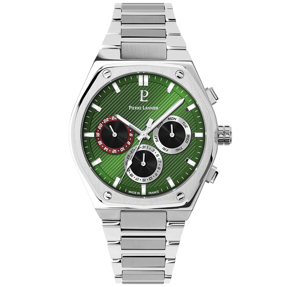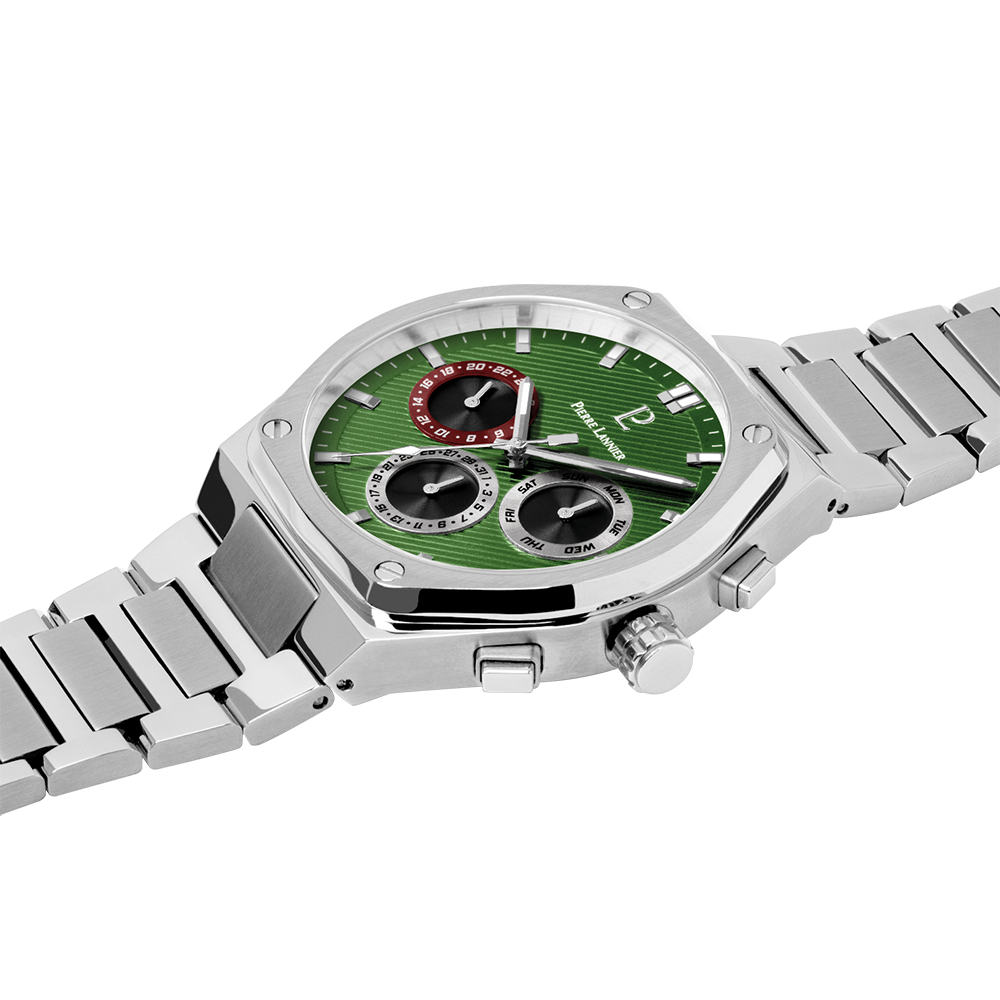 Merülj el az eleganciában a Copilote 230F171-gyel! Kétkomponensű, erdőzöld számlapja és fényes, matt ezüst rozsdamentes acél szíja egy multifunkcionális karórává teszi, amely a merészséget és a kifinomultságot ötvözi. Hordó alakú tokjával és csavaros lünettájával stílusosan kísér el minden kalandodon.