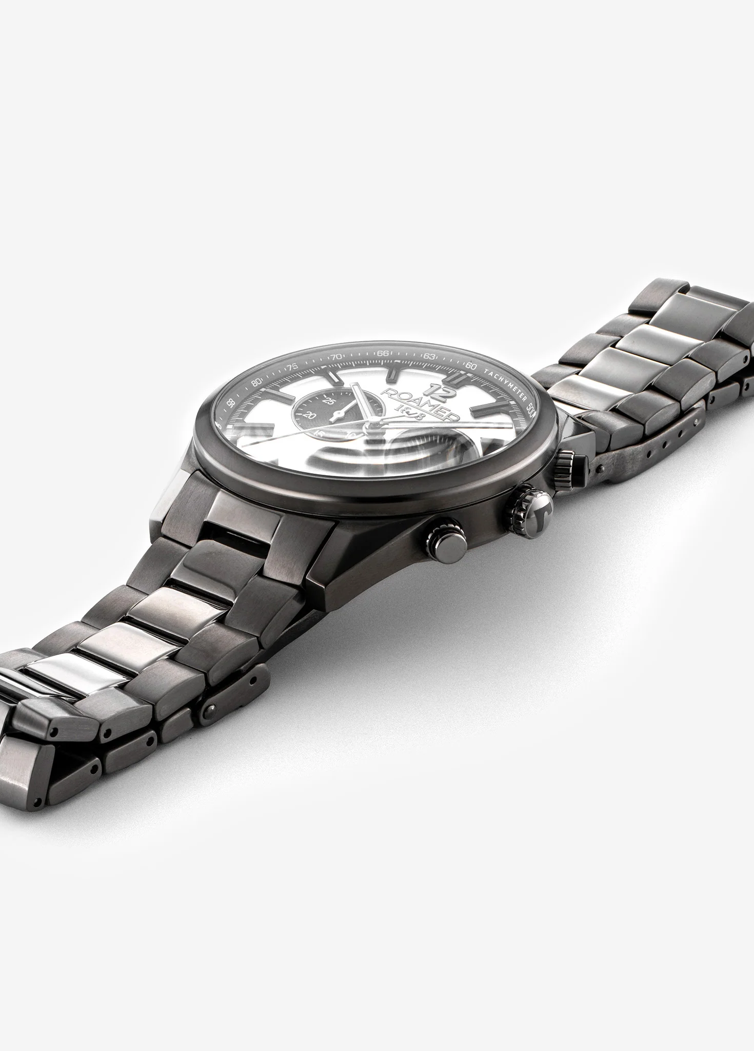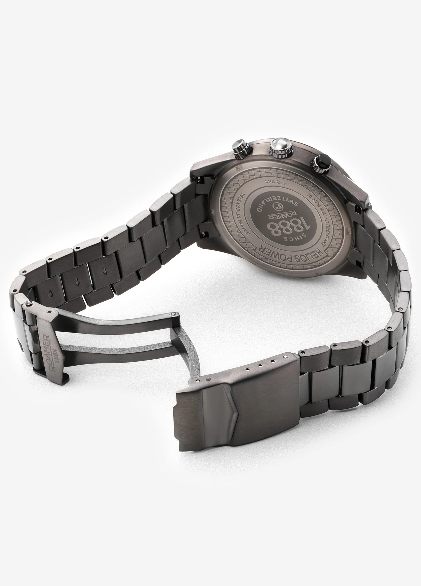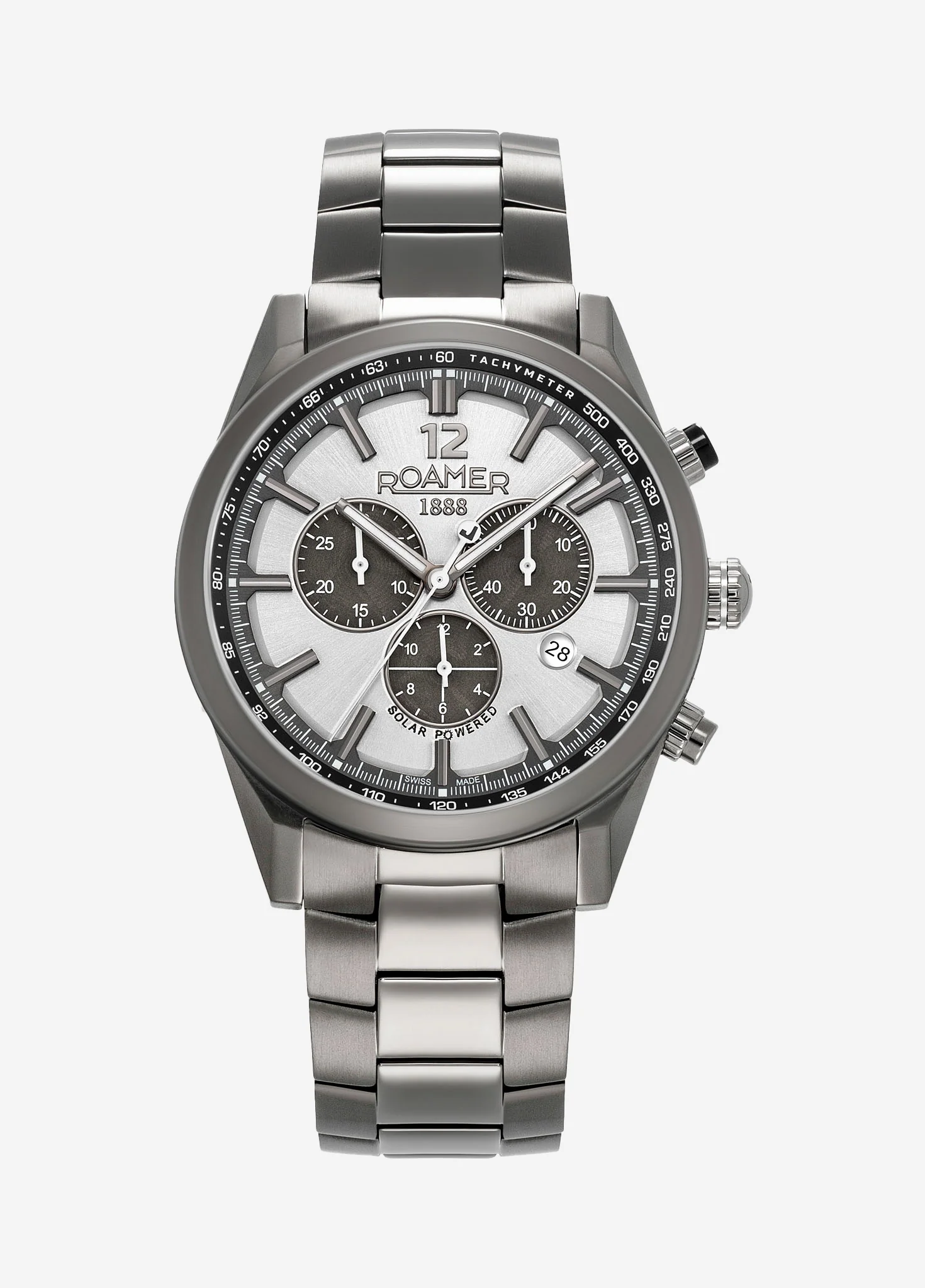 Fedezd fel a Roamer HELIOS POWER karóráját, ahol a csúcstechnológia találkozik az időtlen eleganciával. A 43 mm-es titán tokba és szíjba zárt óra ionbevonatú felülete elegáns és modern megjelenést, eközben tartós erőt is biztosít. Napenergiával működő, svájci gyártású kvarc kronográf, mely minden egyes mozdulattal megtestesíti a pontosságot és a megbízhatóságot.